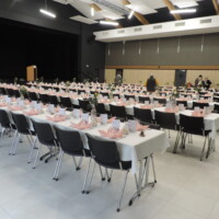 La capacité d’accueil maximum est de 250 personnes assises, la salle peut accueillir 400 personnes debout.